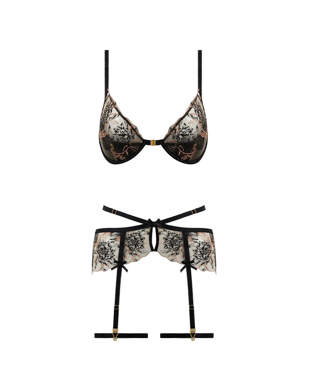 The push-up bra enhances cleavage with structured cups and underwire support, while adjustable straps ensure a customized fit. The coordinating embroidered garter belt cinches the waist and features adjustable garter straps for pairing with thigh-high stockings. A matching embroidered thong completes the look with a barely-there silhouette that balances softness and edge.