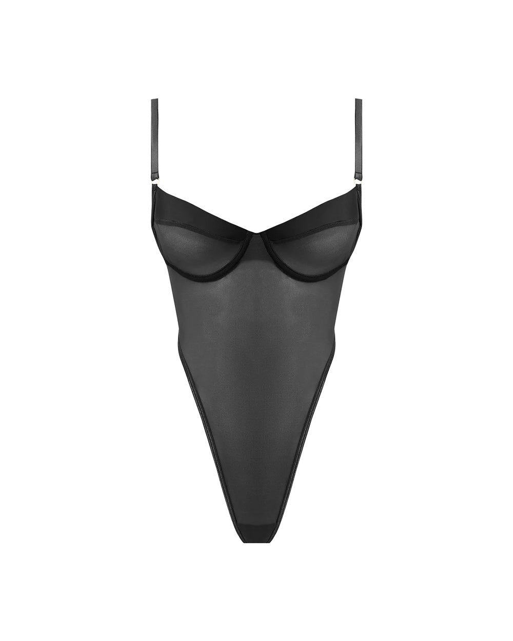 The Raquel Bodysuit is unapologetically sheer, sculpted to celebrate the body from every angle. Crafted from fine mesh with silky underwire cups, this piece balances soft transparency with structured support for a look that’s equal parts seductive and refined.
