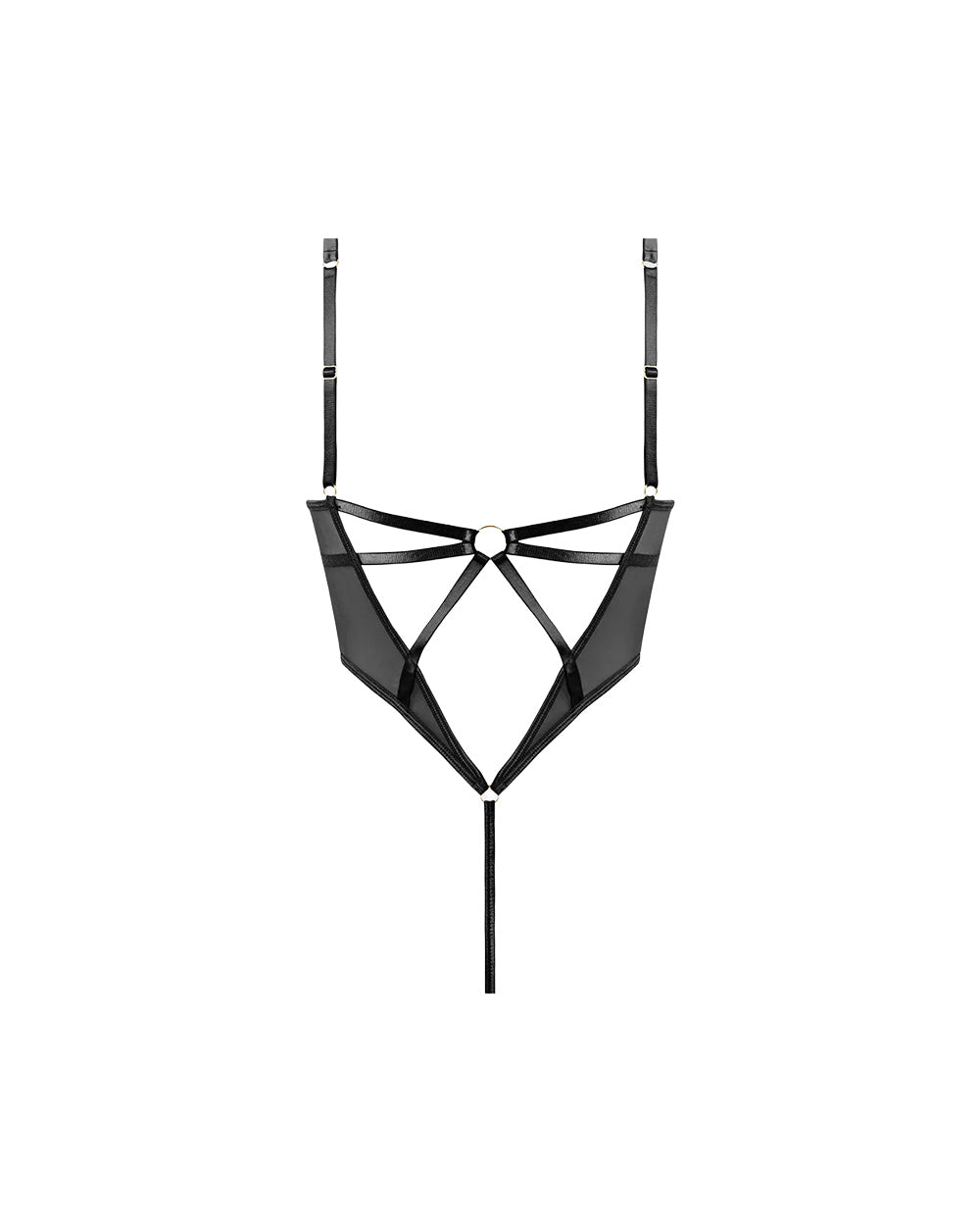 A plunging micro-underwire bra shapes and lifts, while the high-cut silhouette elongates the legs and frames the waist. The back reveals an intricate harness-inspired strap design, adding a subtle bondage edge that feels intentional—not costume. Adjustable straps ensure a customized fit, making Raquel as wearable as it is daring.
